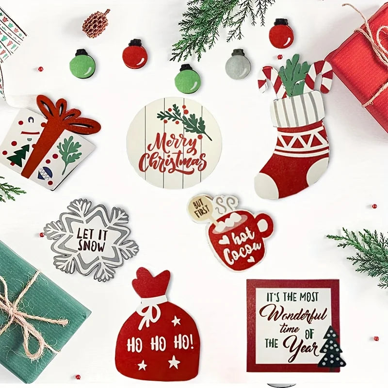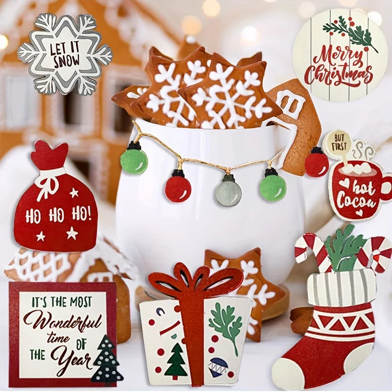 Christmas Tiered Tray Set Wooden Decoration Set Farmhouse Christmas Decor Bell Coffee Cup Snowflake Cookie Wooden Signs