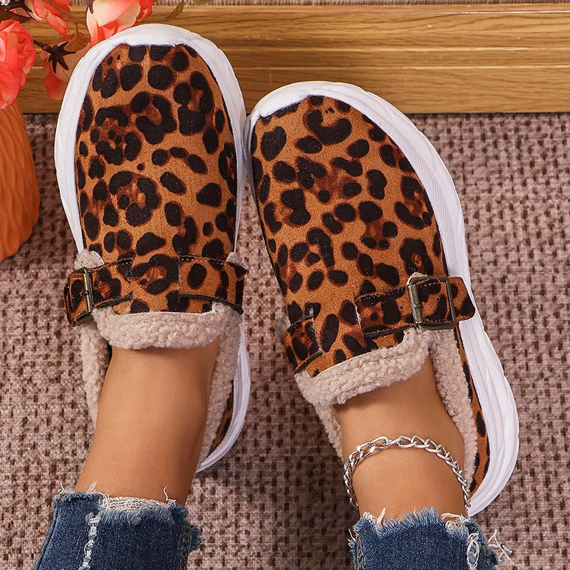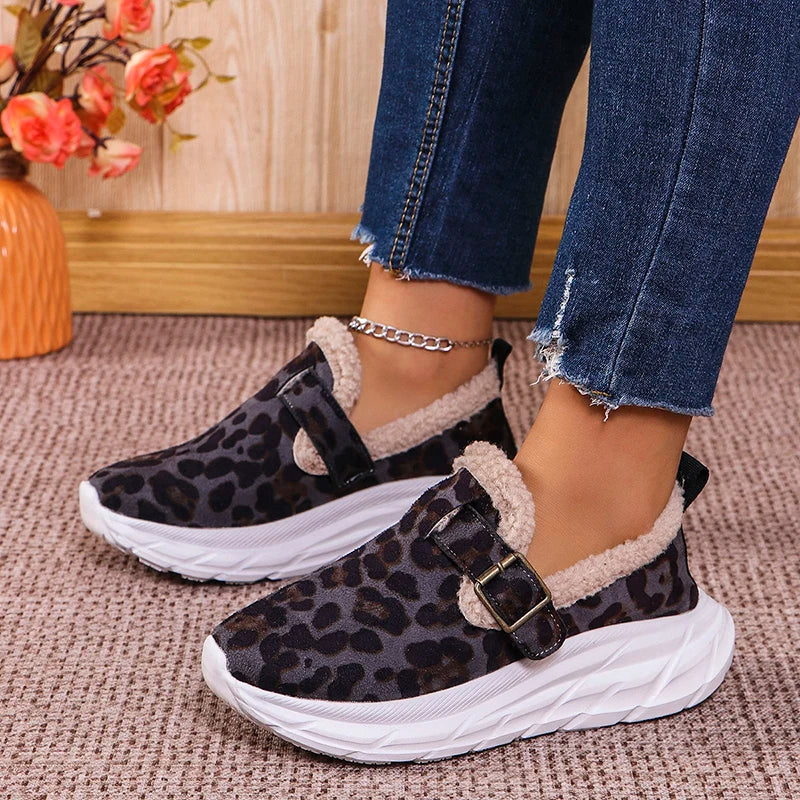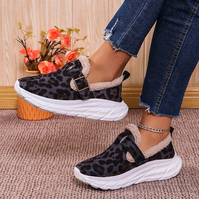 Fashion Leopard Print Wedges Sneakers Women's Faux Wool Lined Thick Sole Sport Shoes Winter New Shallow Running Shoes Mujer