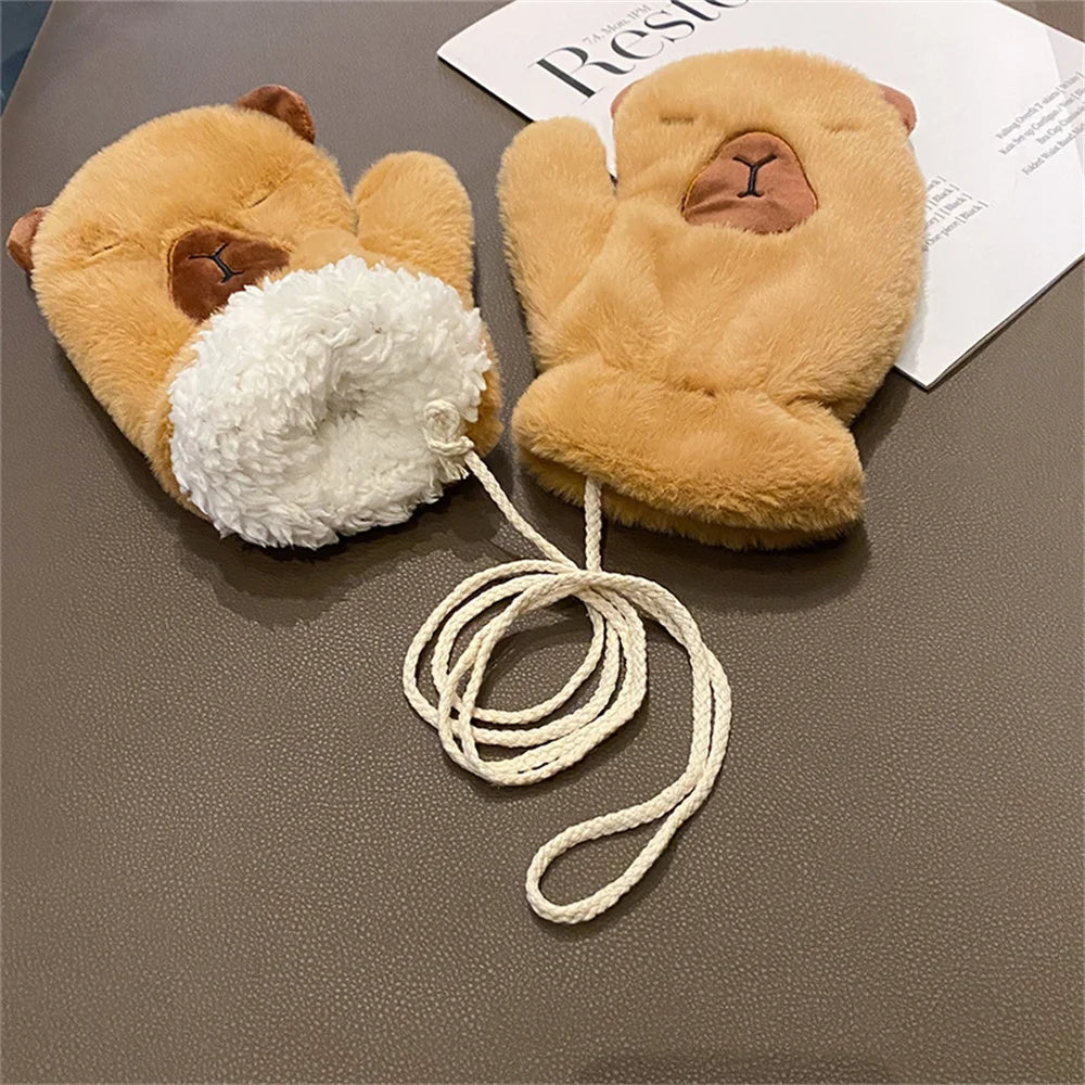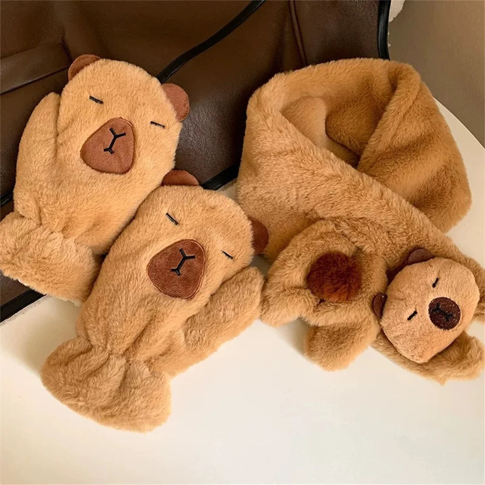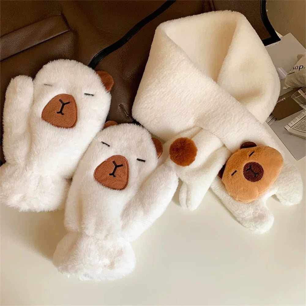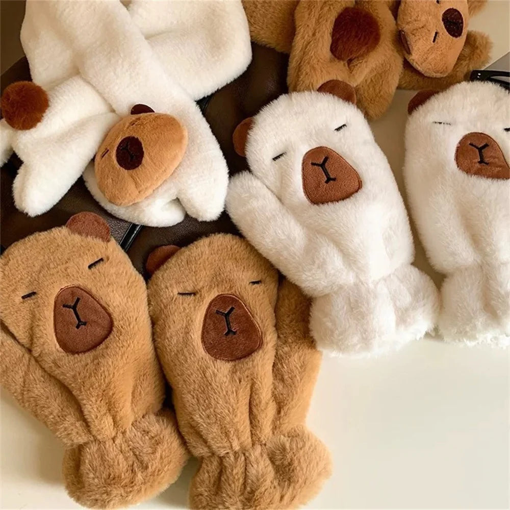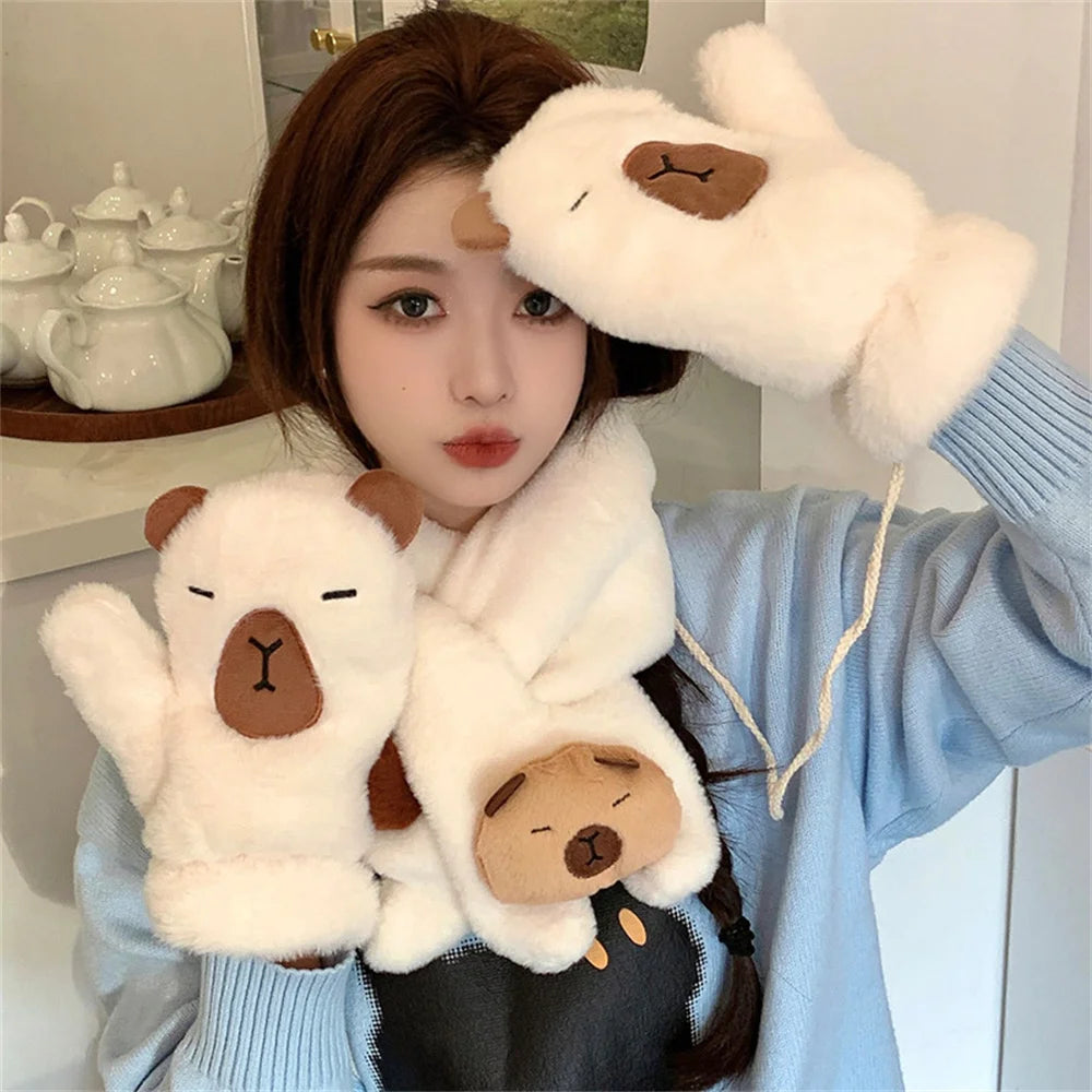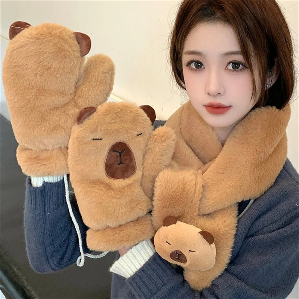 Women Girls Capybara Plush Gloves Fashion Cycling Neck Warmers Neck Scarf Windproof Mittens Driving Running Accessories