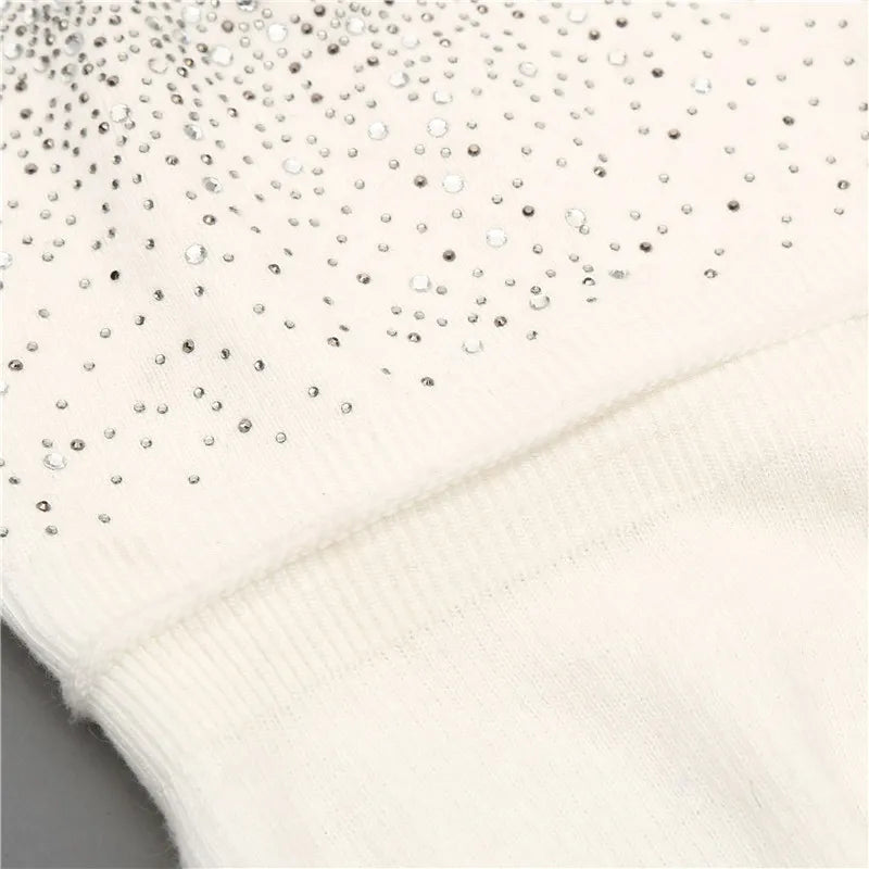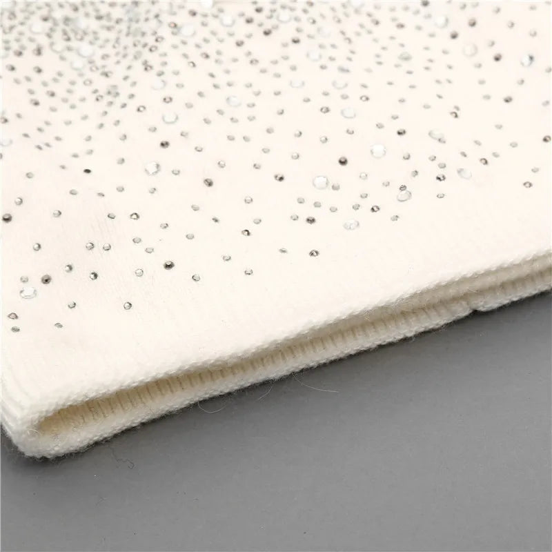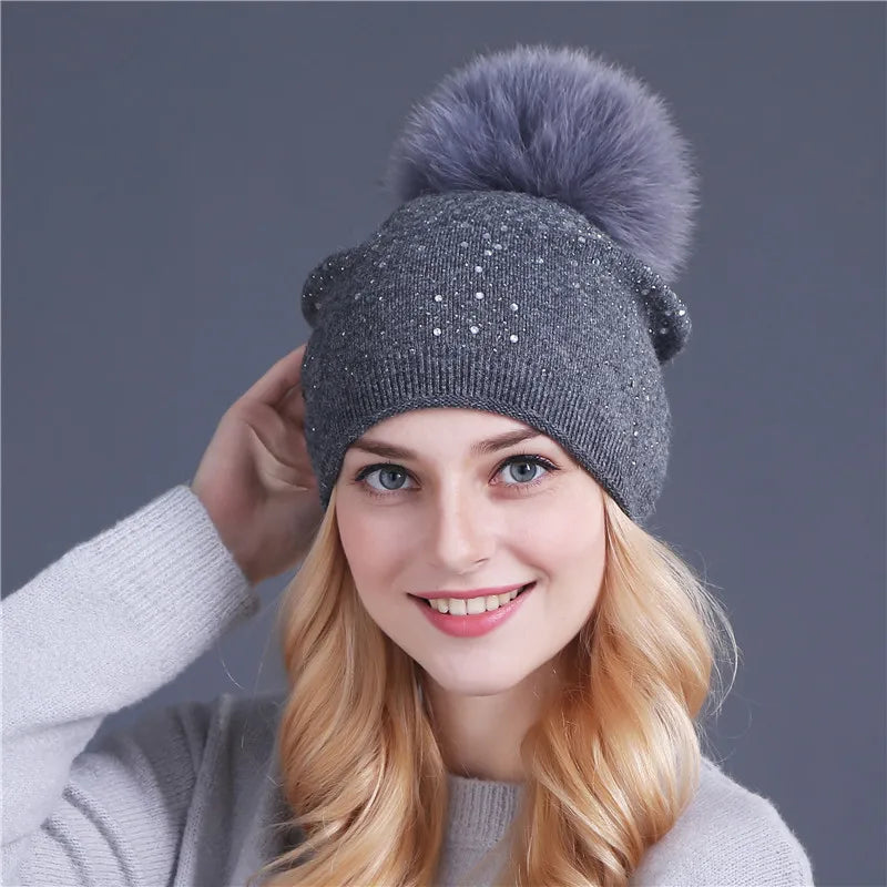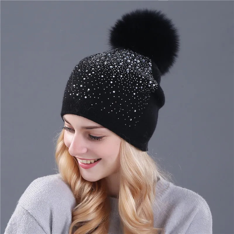 Women's Winter Beanie Hat – Soft Rabbit Fur Wool Knitted Hat with Mink Pom Pom and Shining Rhinestone Accents, Stylish and Warm